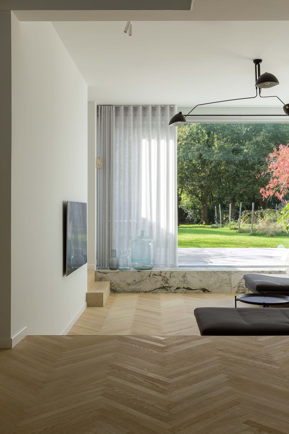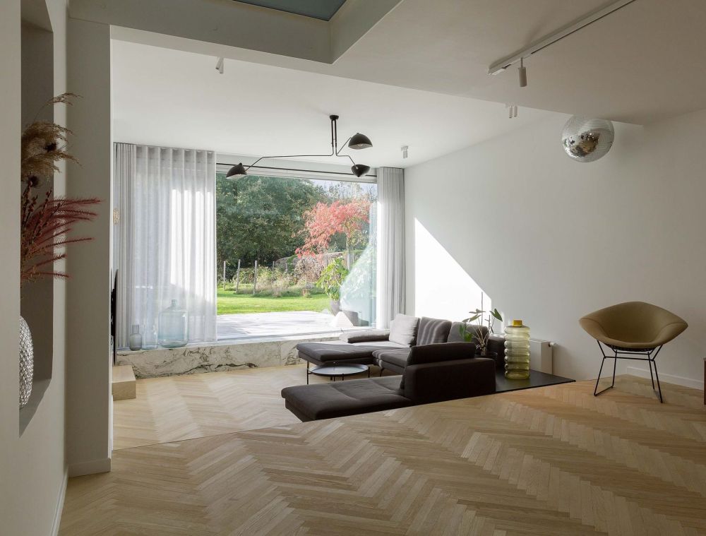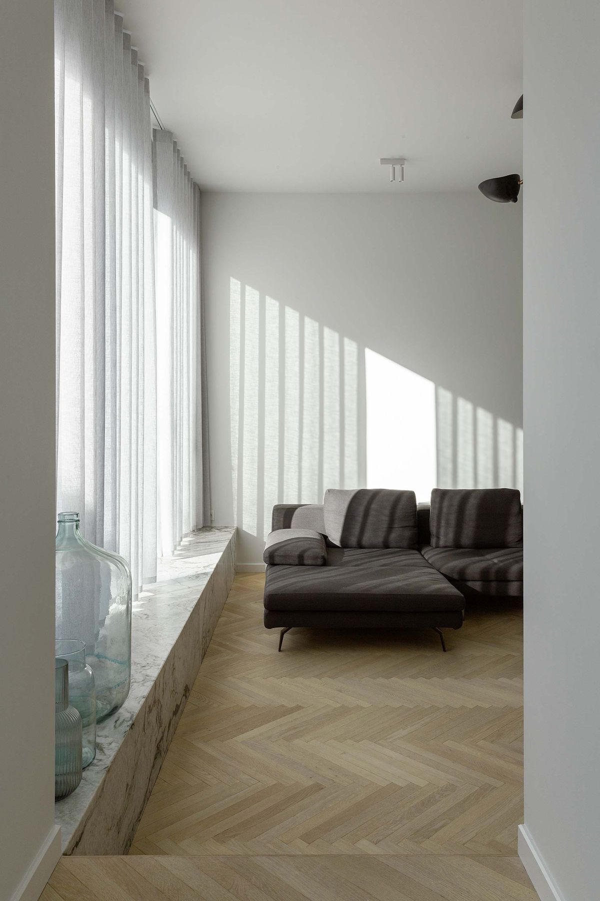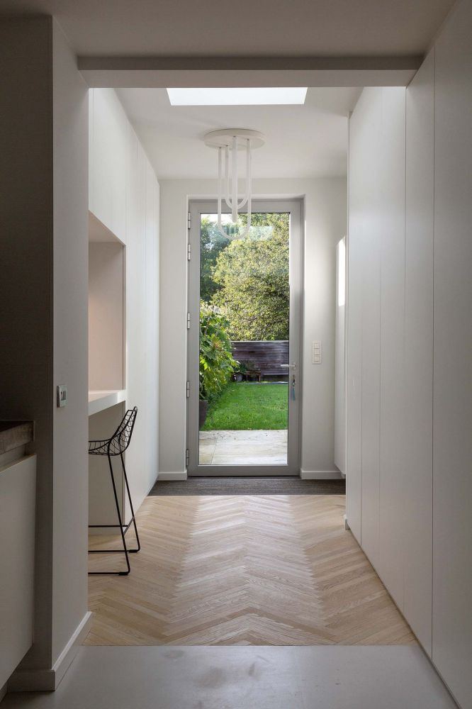 Deze hedendaagse rijwoning is een oase van rust dankzij de sobere en warme aankleding en de relatie met de achterliggende tuin. Via de voordeur in de vrij gesloten voorzijde betreed je meteen de grote, doorlopende woonruimte en wordt je blik naar de tuin gericht. Vanuit de zitkuil hebbenbde bewoners ongehinderd zucht op de lange, smlle tuin. Het visgraatparket lijkt de gewense kijkrichting aan te wijzen. Opstapjes overbruggen het niveauverschil en leiden naar de keuken met de ontbijtnis en de eetruimte aan de voorzijde. Een deels glazen plafondn vormt een visuele verbinding tussen de gelijkvloerse verdieping met de multifunctionele ruimte op niveau 1. Hier viel de keuze op een geolied merbau planken parket.
