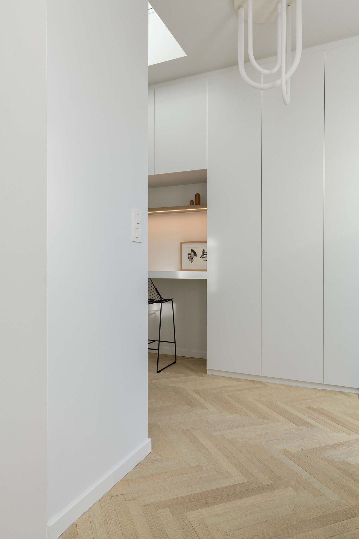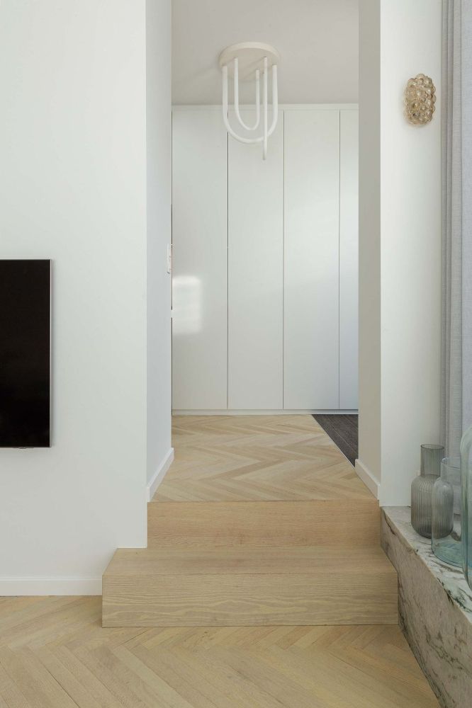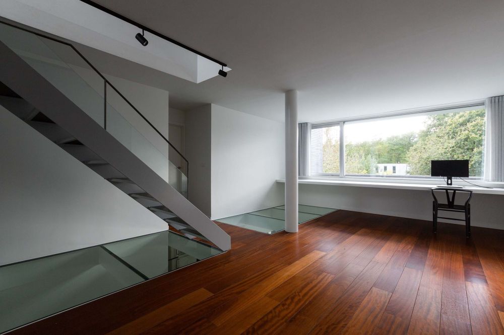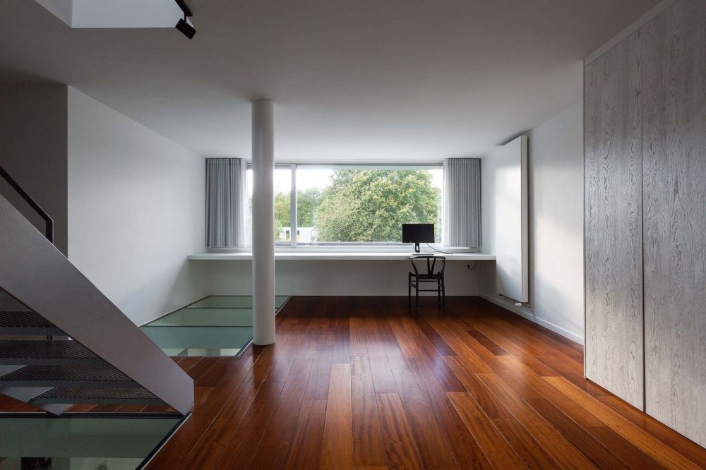 Deze hedendaagse rijwoning is een oase van rust dankzij de sobere en warme aankleding en de relatie met de achterliggende tuin. Via de voordeur in de vrij gesloten voorzijde betreed je meteen de grote, doorlopende woonruimte en wordt je blik naar de tuin gericht. Vanuit de zitkuil hebbenbde bewoners ongehinderd zucht op de lange, smlle tuin. Het visgraatparket lijkt de gewense kijkrichting aan te wijzen. Opstapjes overbruggen het niveauverschil en leiden naar de keuken met de ontbijtnis en de eetruimte aan de voorzijde. Een deels glazen plafondn vormt een visuele verbinding tussen de gelijkvloerse verdieping met de multifunctionele ruimte op niveau 1. Hier viel de keuze op een geolied merbau planken parket.